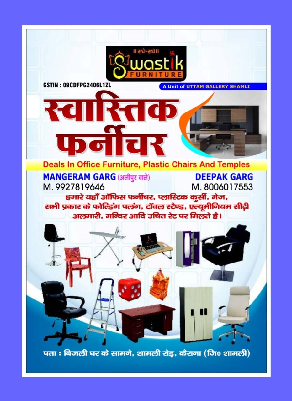 स्वास्तिक फर्नीचर कैराना में आपके लिए एक शानदार रेंज लेकर आया है, जिसमें प्लास्टिक कुर्सियां, मेज, सभी प्रकार के फोल्डिंग पलंग, टॉवल स्टैंड, अलमारियां और यहां तक कि सुंदर मंदिर भी शामिल हैं। यह सब कुछ सस्ते दामों पर और उच्चतम गुणवत्ता के साथ उपलब्ध है।
