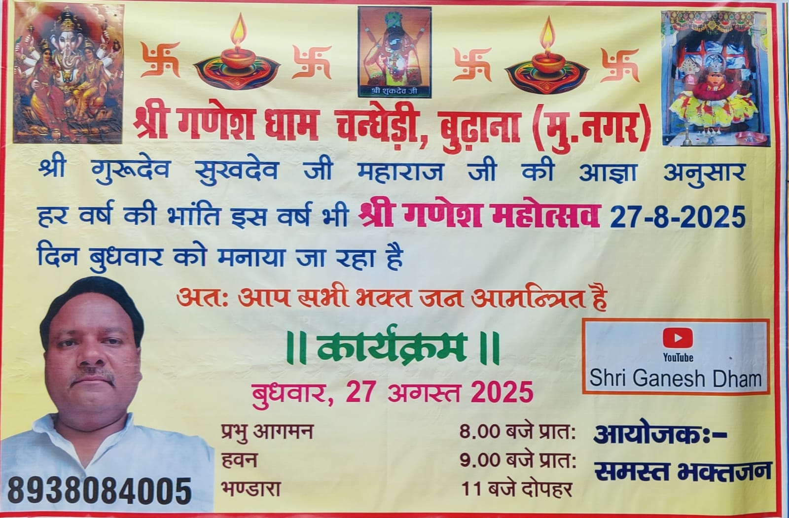 बुढ़ाना। जिला मुजफ्फरनगर के कस्बा बुढ़ाना स्थित गांव चंधेडी में 27 अगस्त 2025 को भगवान गणेश जी का महोत्सव एक भव्य और धूमधाम के साथ मनाने की तैयारी चल रही है। इस पावन अवसर पर, श्री गणेश धाम के आचार्य गुरु श्री सुखदेव जी महाराज ने सुनिश्चित किया है कि इस वर्ष भी भगवान श्री गणेश जी को भक्ति और श्रद्धा के साथ समर्पित किया जाएगा।