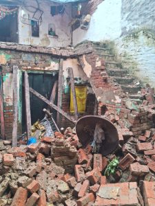 कैराना। नगर के मोहल्ला अफगानान् में हुई तेज़ बरसात ने एक परिवार पर कहर बरपा दिया। मोहल्ला निवासी परवीन के मकान की छत अचानक भरभरा कर गिर गई। हादसा इतना भीषण था कि देखते ही देखते पूरा घर मलबे में तब्दील हो गया।