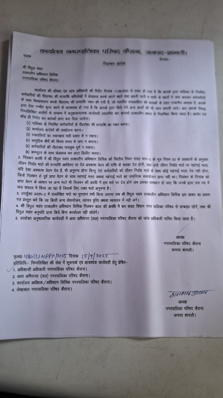 कैराना (शामली)। नगरपालिका परिषद कैराना में कर्मचारियों के भविष्य निधि (पीएफ) में गड़बड़ी का गंभीर मामला सामने आया है। इस पर तत्कालीन अधिष्ठान लिपिक श्री विपुल पंवार को निलंबित कर अनुशासनात्मक कार्यवाही शुरू कर दी गई है।