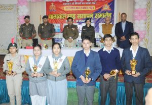 प्रतियोगिता में उत्कृष्ट स्थान हासिल करने वाले छात्र-छात्राओं व यातायात माह के दौरान सहयोग करने वाले उद्यमियों को सम्मानित किया गया।